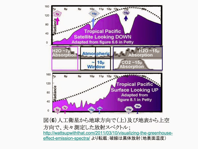 図(6)上図に示されているのは、人工衛星から観測した地球からの放射スペクトルである。下図は、太平洋上熱帯地域での上空からの赤外線放射である。http://wattsupwiththat.com/2011/03/10/visualizing-the-greenhouse-effect-emission-spectra/ つまり、上のグラフが地球から出て行く赤外線のスペクトル、下のグラフが上空から地上に放射される赤外線のスペクトルである。破線は地表表面温度の黒体放射曲線とだけ書かれているが、ヴィーンの変位則から計算すると300K位である。