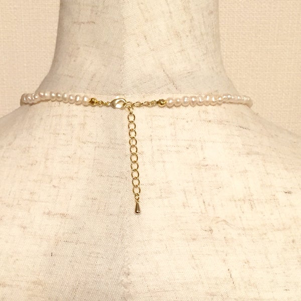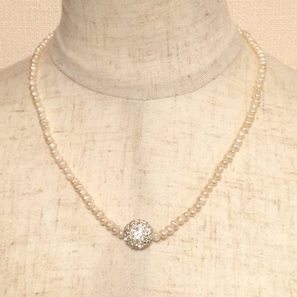 お客様の髪型、お顔の輪郭、雰囲気をイメージしながらカジュアルにもサラリと使える淡水パールとキラキラボールのネックレスの出来上がり。