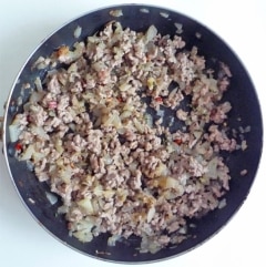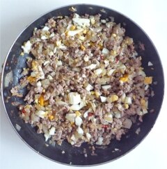 挽肉に火が通ったら、みじん切りにした茹で玉子を混ぜ合わせ、火からおろします。