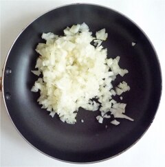 オイルをひいたフライパンで、みじん切りにした玉ねぎを炒めます。
