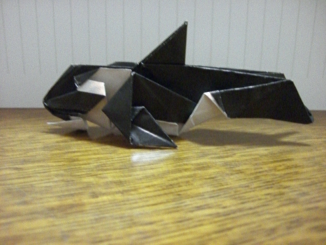 オルカ折るか山田勝久さんの『折り鶴から折る おりがみ水族館』から「シャチ」折紙レビューで見て折りたくなったので。「シャチ」の折り図は手元にあと二つ、大谷徹さんのと神谷哲史さんのがあります。どちらから折るか迷うとこですが、前に大谷さんの「シャチ」を折った時に尻尾の折りが上手く出来なかったので、再チャレンジということでこちらから折ることにしますかな。シャチの英名はオルカ。