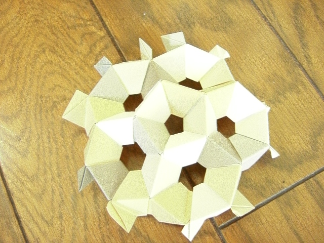 両面かめのこ凹型 1布施知子さんの『折ってなるほど! ゆかいな多面体』から「両面かめのこ凹型立体」の90枚組みはじめ。やるぞ!と思って紙を揃えて、一枚を八等分してからパーツを作るのに一ヶ月くらいかかってます。折るのが難しいのではなくて単に気力が減退しているだけ。組んでいくのは簡単なのですぐに出来ると思います。