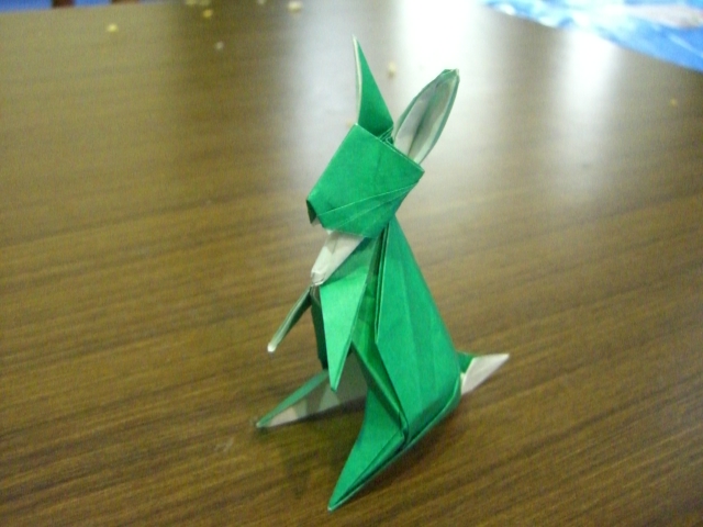 うさぎ『折紙探偵団コンベンション折り図集vol.6』から小松英夫さんの「うさぎ」マクレガーさんちの畑で辺りの様子を伺うピーターラビットみたいなイメージの愛らしいウサギです。立ち姿のウサギというのも珍しい気もする。もうちょっと練習してウサギらしい色で折りなおしたいと思います。この「ウサギ」の載ってる折り図集はもう絶版、ヤフオクではぼったくり価格で売ってましたが、とある図書館に入ってることが分かってます。興味がある人は探してみてくださいな。