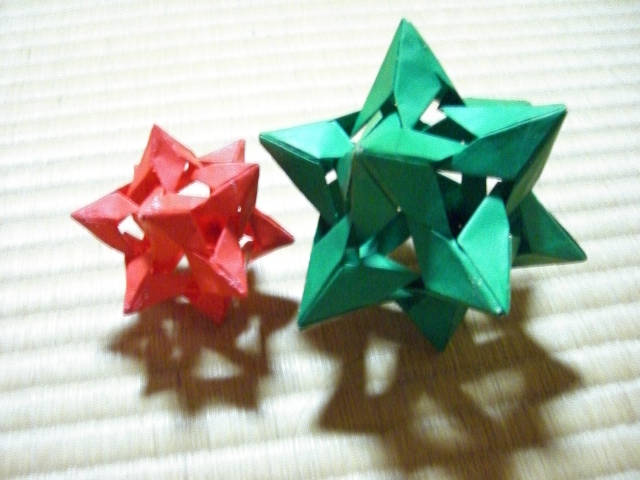 9月の玄関飾り川村みゆきさんの「ツイスター」赤いのは2×5cm緑のは3×7,5cm30枚組みユニット。糊付けしてます。新しく組んだのは緑色の方。週末に行ってきた四国の小高い山々を思い出して色を決めました。赤い方は糊付けが下手で汚くなってるのでもう一個綺麗に糊付けをしたものを作りたいと思います。