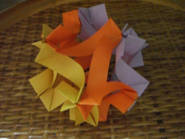 フレキシブル・ボール『第10回記念 折紙探偵団 国際コンベンション 折り図集Vol.10』から川崎敏和さんの「フレキシブル・ボール(Flexible ball)」30枚組みのユニット。タントを三色使用しました。比率のサイズをそのまま組むと直径6cmくらいに収まります。パーツを折るのは凄く簡単、組むコツが分かると最後まであっという間に出来ます。