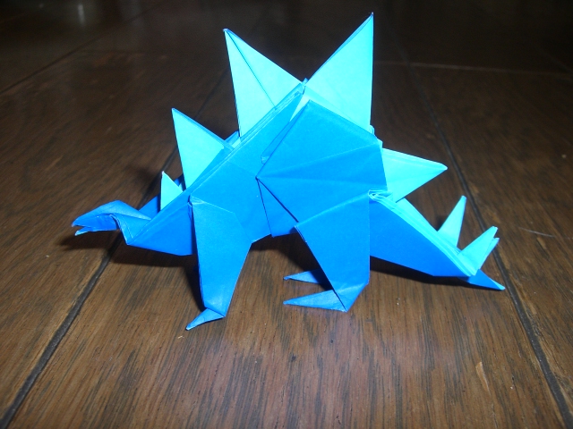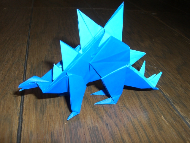 ステゴサウルス Stegosaurus川畑文昭さんの『恐竜のおりがみ1』から「ステゴサウルス」2枚複合です。背中の凸部分の色が変わるので裏が白色じゃない紙の方が良さげ。ちょろっと尻尾が見えてた恐竜はステゴさんでした。『空想おりがみ』に掲載の一枚折りのステゴさんは去年の東海コンで展示されてましたよね。180cmの紙から折っただけあってどどーんとしてました。この2枚複合ものも大きな紙で折ってもっと迫力出したいな。