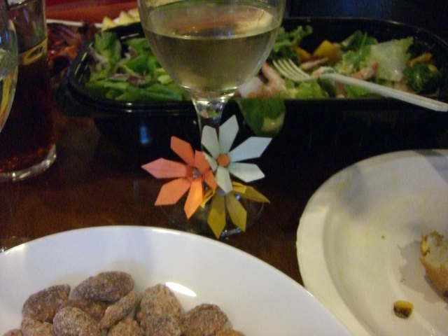 花のグラスマーカー『折紙探偵団MAGAZINE 通巻91号』から山口真さんの「正三角形からの花 B」一般に流通している本『飾れる!贈れる!かわいい花の折り紙』にも多分載ってますので今すぐ折りたいって人はそちらをお求め下さい。先日参加しました「イベリコ豚とワインの会」に持って行ったグラスマーカー。大変好評でした。紙は7cm四方の美濃和紙を花1個につき2枚三角形に切り出して使うので面倒といえば面倒。でもこういう物が幾つかあると話のネタにもなってパーティでは便利なのです。