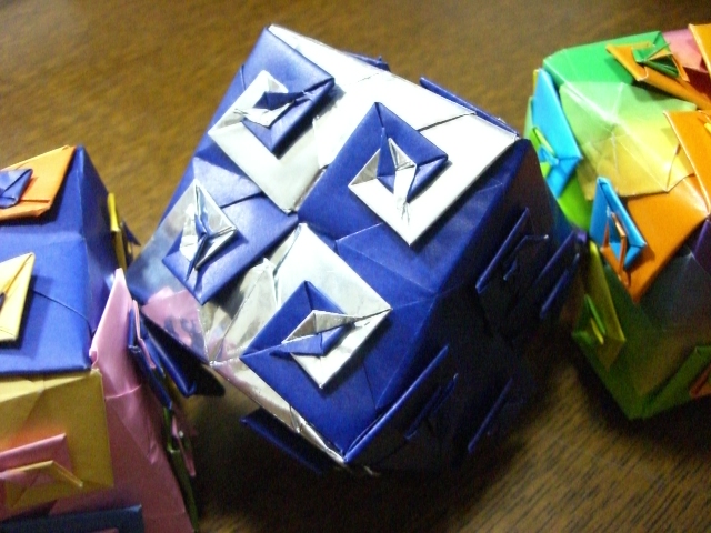 うずまきユニット 2川崎敏和さんの「うずまきユニット」紙を2色にしたら思いの外良い感じに仕上がりました。白と黒で陰陽マークみたいなにしたかったんですが黒の折り紙が近所に売ってなかったので代わりに銀色と紺色で組んでます。折りも簡単なのでしばらくユニットはこればっかりやってそう。ちょっと大きさと形を変えてやってみますか。