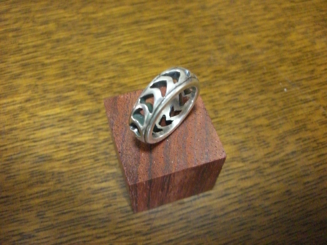 透かしリング3 仕上げ(金工41日目前半)31-32日目に作っていたワックスがようやく鋳造から返ってきました。これを湯道の残りを糸鋸で落としてヤスリで形を整えてバレルに20分。240-400-600-800番の順に紙やすりをあて六十〇ハップで溝と穴を燻す。溝の部分の燻しが取れないように気をつけて1000-1500番と紙やすりで磨いてからバフモーター。穴に詰まった青棒の粉をシンナーで溶かして超音波洗浄機で五分。水洗いをしてからウィノールでつや出しして完成。