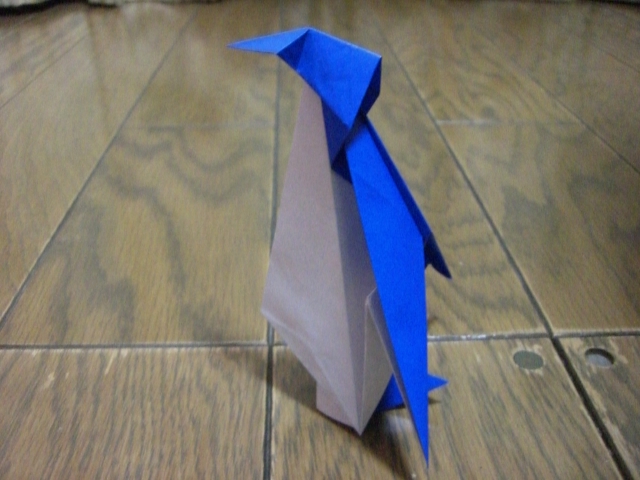 ペンギン『季刊をる No.16』から小松英夫さんの「ペンギン」折り図のものより足を多めに中割りしてます。上手く傾いて立たせられなかったので苦肉の策。同じように折れたはずなんですが・・謎です。作品のモデルを想像するのが1つの楽しみでもあります。ペンギンも沢山種類居てますからその中で最も近いのはどれだろうと色々推測したり、ペンギンと呼ばれる生き物の特徴を全て表現した形かなと考えたりとかね。