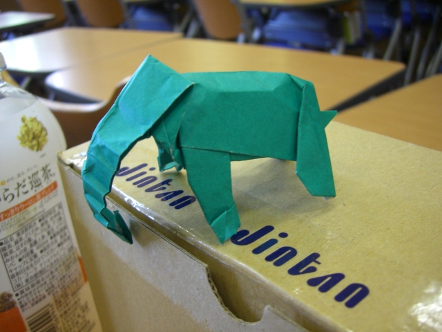 例会の待ち時間に凧の基本形から折る「体の一部が長い四足生物」