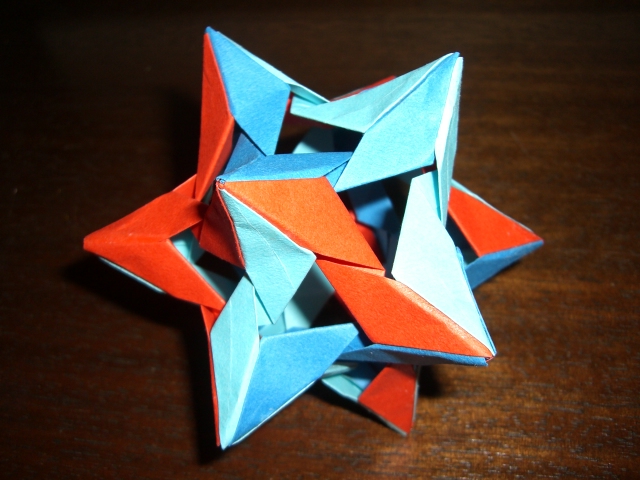 ツイスター 再掲『季刊をる NO.12』から川村みゆきさんの「ツイスター」15cm四方のタント3枚から30枚を切り出して組んでます。「跳ねるツイスター」のことを聞いたので完全に糊付けしてみました。糊があんまり良い糊ではないのでちゃんと接着されてないかも。私は正確に紙を切って折るということが不得手なので組むといつもどこかズレが出て完全体ではないんですよね。ユニットの「手」を入れる「ポケット」が浅い作品には大体糊付けというパターン。