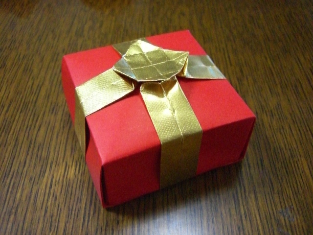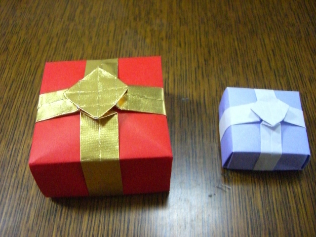 ギフトボックス『折紙探偵団コンベンション折り図集vol.7』から山田 純さんの「ギフトボックス」赤と金の両面折紙は24cmのが6枚で462円。1枚70円と高いけれどここで使わないでいつ使うんだという感じです。それくらいイメージに合った作品に出会えました。他にも緑と金の両面も売ってたので買ってみようかな。