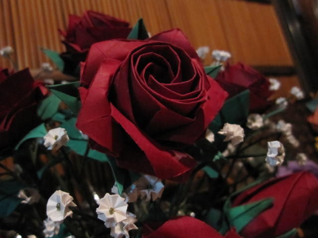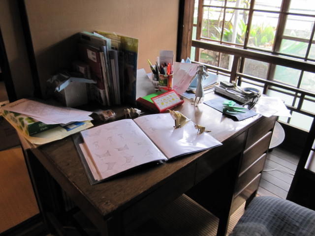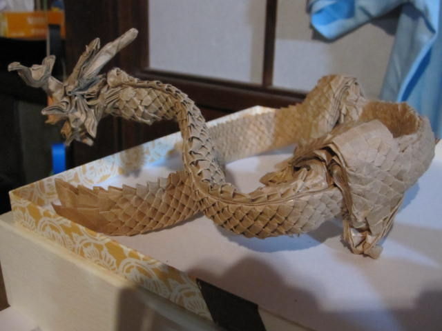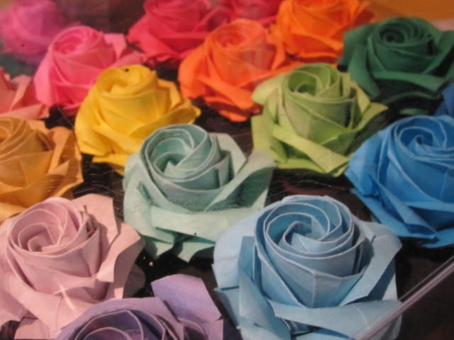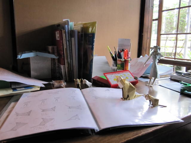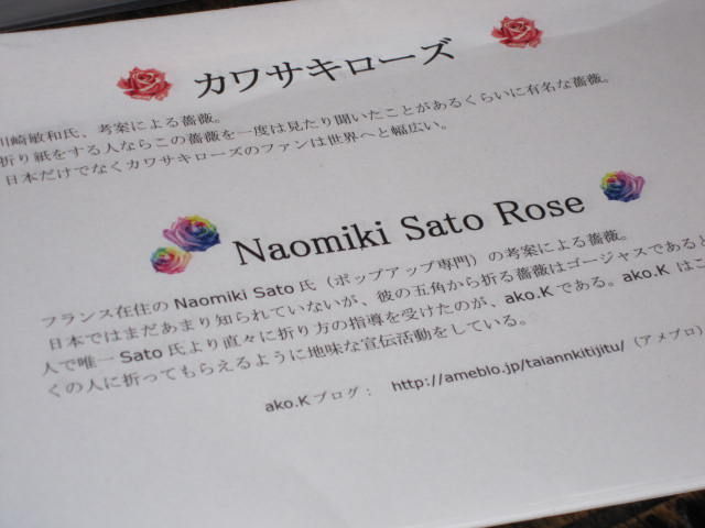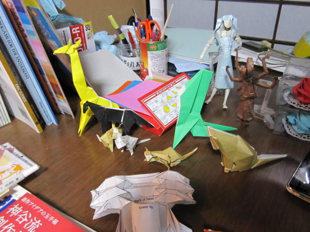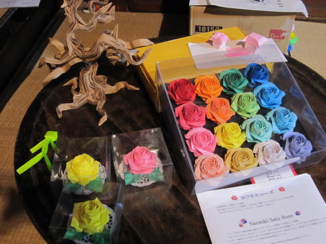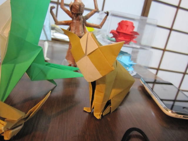 Okayama Origami Quartet 110月22日から24日まで開催されたOkayama Origami Quartetの記録。出展者 米田君(コンプレックス) 各務君(ユニット・コンプレックス) ako.kさん(ナオミキローズ) 私(tessellation)かじこの玄関をくぐるとサトウナオミキさん直伝の薔薇が出迎えてくれます。薔薇でこんだけ高さを感じる作品はあんまり無い。米田君の折った神谷哲史作品群。米田君のブログ1周年記念で折られた神谷さんの「龍神3.5」折紙してる人の机を再現できたかな?