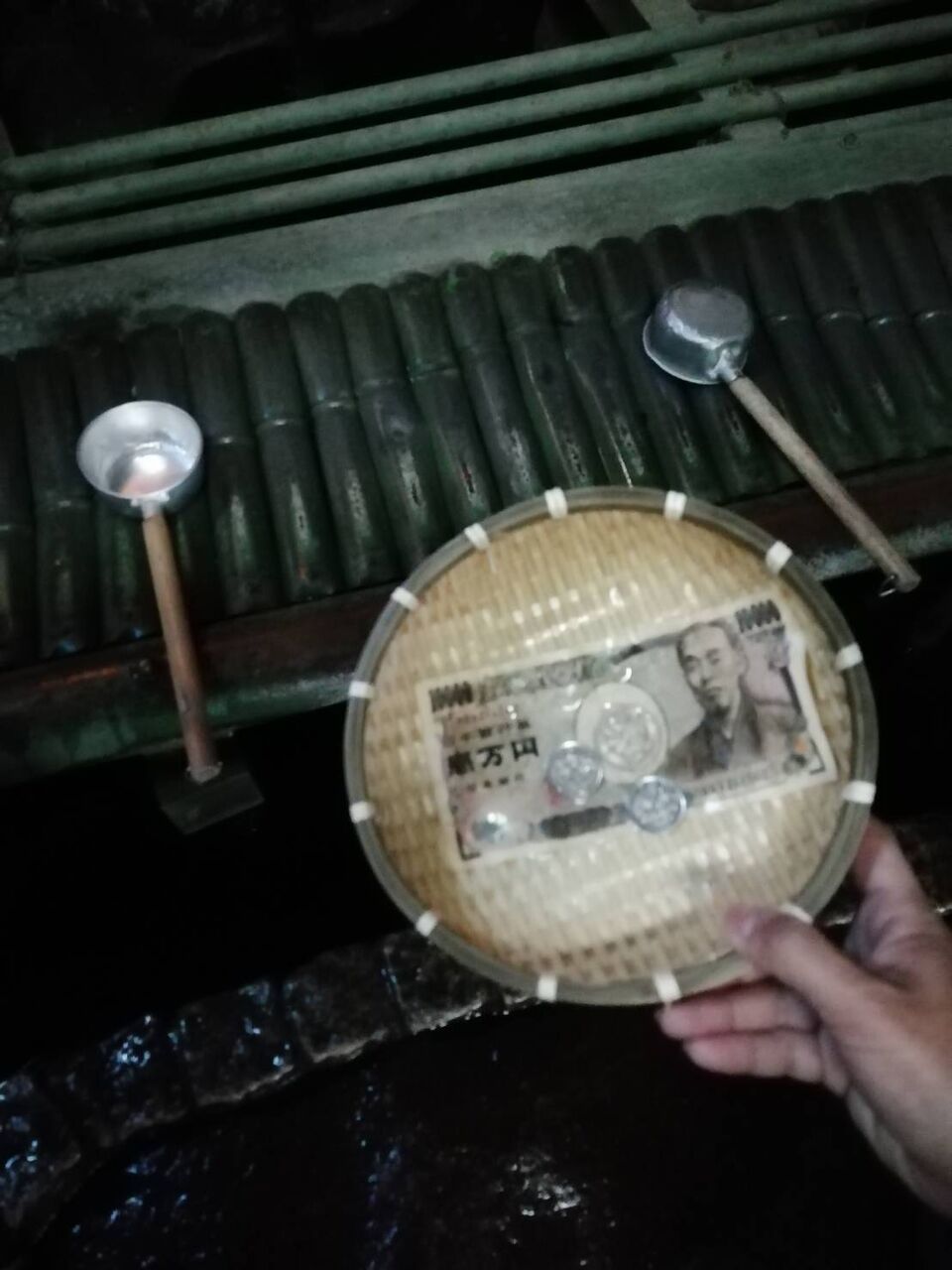 こんな感じでざるにお金を入れて、柄杓で洗います