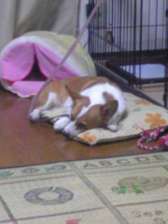 ただ、まだ家中走り回ったりしないように、ケージにリードでつながれて少しだけ自由![]()