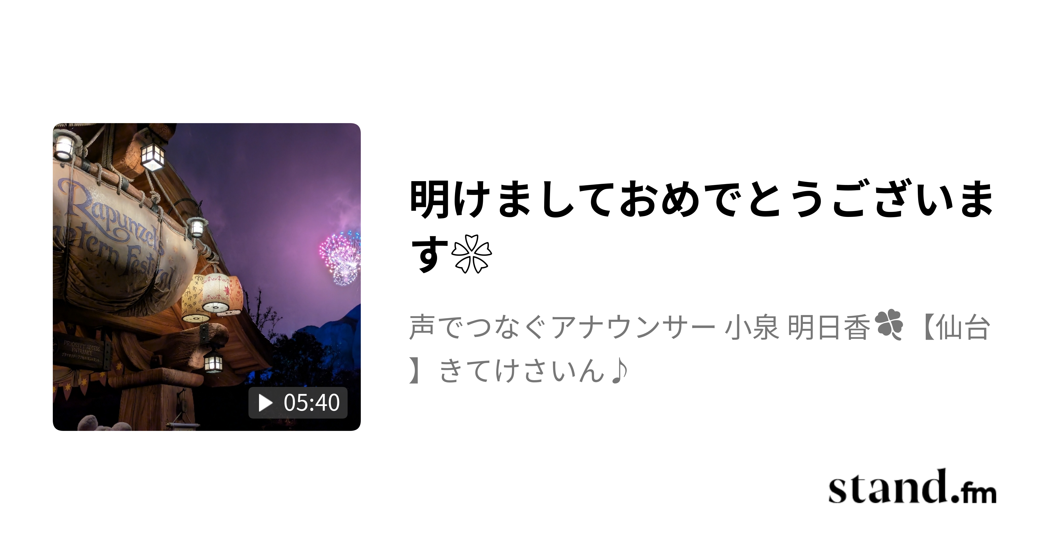 明けましておめでとうございます❀ - 声でつなぐアナウンサー 小泉 明日香🍀【仙台】きてけさいん♪ | stand.fm明けましておめでとうございます🌸🎍 今年も宜しくお願い致します🍀 声でつなぐアナウンサー、ナレーター 仙台の 小泉 明日香です🍀🎤 皆さんは、 どんな年末年始を過ごされましたか? ぜひ教えてくださいね〜〜🌟 私は、 クリスマス🎄当日に、 ディズニーシーに行きました🌊 ラプン…stand.fm
