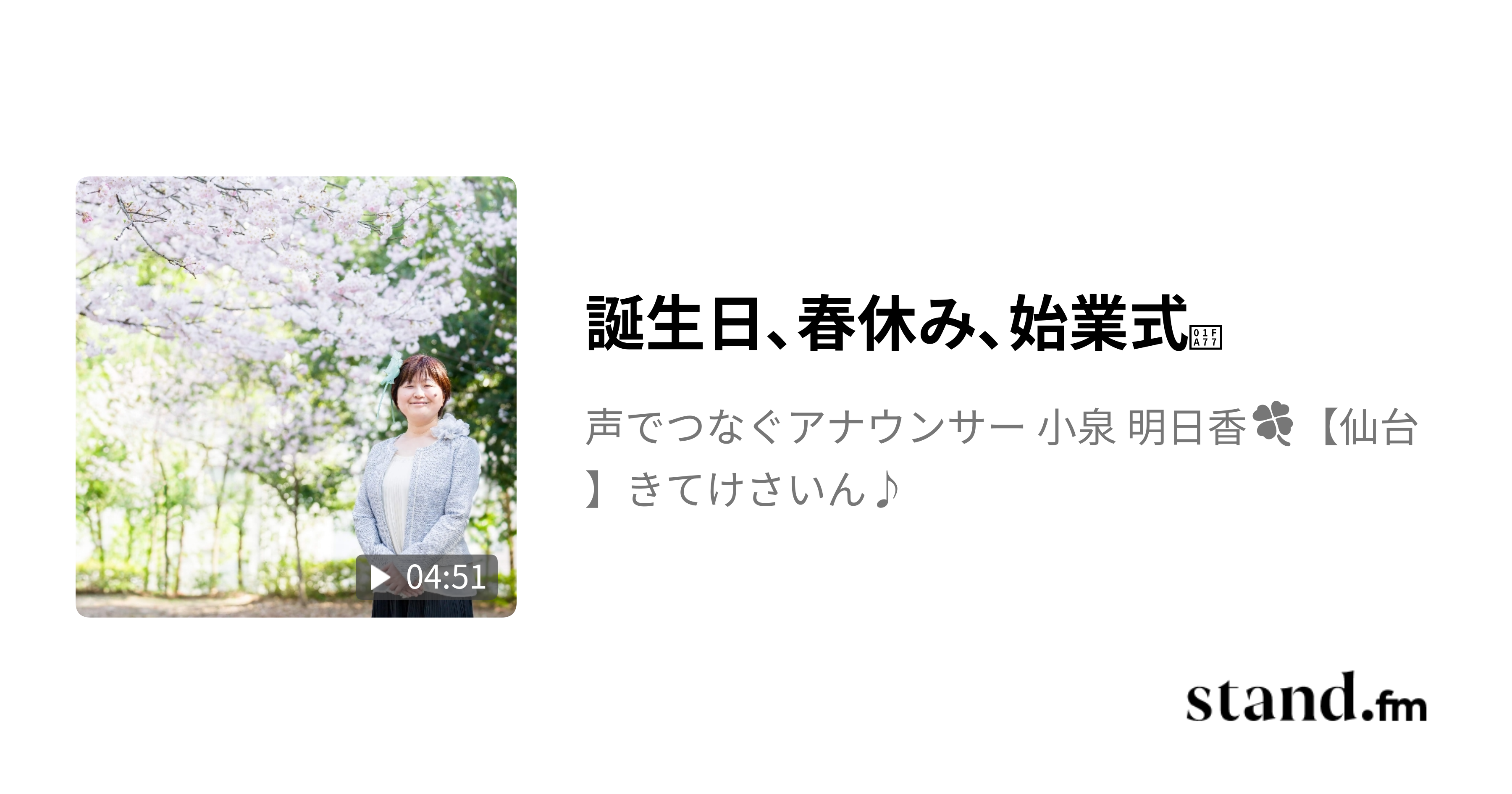 誕生日、春休み、始業式🩷 - 声でつなぐアナウンサー 小泉 明日香🍀【仙台】きてけさいん♪ | stand.fm週の真ん中、水曜日♪ 皆さん、こんにちは🌸 声でつなぐアナウンサー 小泉 明日香です🌼 🩷 きのう4/7は誕生日、 きょうは、子どもたちは始業式🎶 \多くのお客様に響くクリアトーンナレーション/ 🌸日本気象協会/エフエム岩手/ふくしまFM/遠野テレビ 🌸1,300件以上!仙台 光のペー…stand.fm
