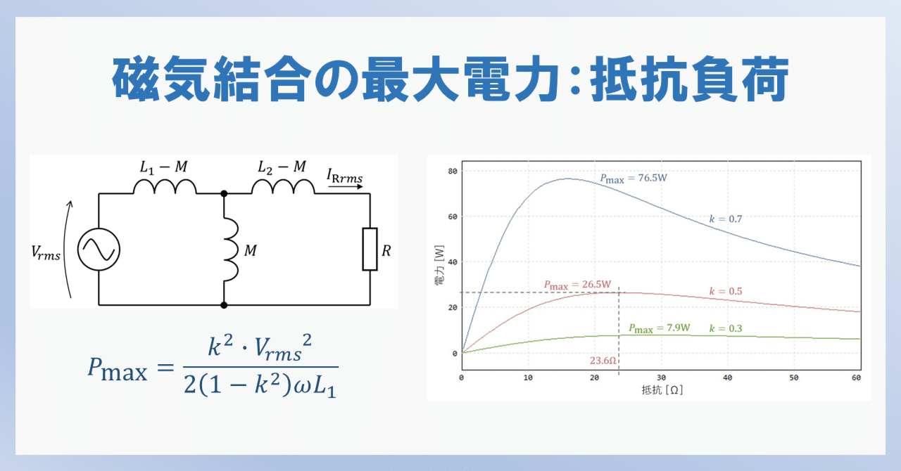 ワイヤレスで伝送できる最大電力の理論計算-その2このブログは、内容を改編してnoteへ移動しました。 ↓↓↓ こちらをご参照ください ↓↓↓ 磁気結合回路で伝送できる最大電力①:抵抗負荷の場合|大羽規夫@ワイヤレス電源技術研究センター前回の記事では、LR直列回路で最大電力を算出しました。 今回は、磁気結合によるワイヤレス給電で伝送できる最大電力を、T型等価回路を用いて導出します。 負荷は抵抗のみとし、前回と同様に回路方程式から解析していきます。 1.回路モデル:T型等価回路 図1に今回の解析対象となる負荷に抵抗が接続されたT型等価回路を示します。 図1 T型等価回路 図中の各記…note.com ▼ブログランキング参加中▼ にほんブログ村 ▲クリックで投票お願いします▲