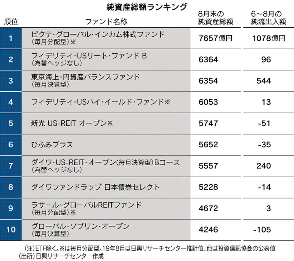 投資でお金を殖やすポイントは利息がさらに利息を生む「複利効果」が欠かせない発想です。しかし運用の利益を上回る分配金を支払うケースが多い毎月分配型は、分配で元本を取り崩すため、この複利効果は働かなくなります。この仕組みのため、金融庁は「顧客の長期資産形成には適さない」と指摘し、販売会社も営業戦略を見直し積極的な提案が下火になっていました。しかし毎月分配型には投資家からの一定のニーズが根強く存在し、国内の公募投信(除くETF)の内、毎月分配型は5月から4ヵ月連続で資金流入が流出を上回り、純資産残高を増やしたようです。8月末の残高上位10本中、8本が毎月分配型となっています。