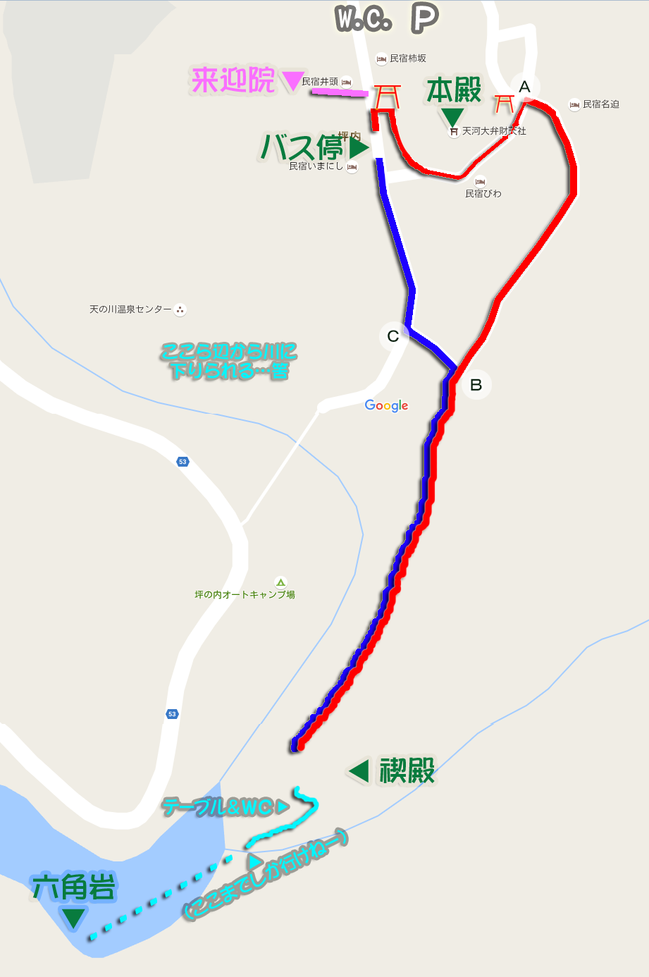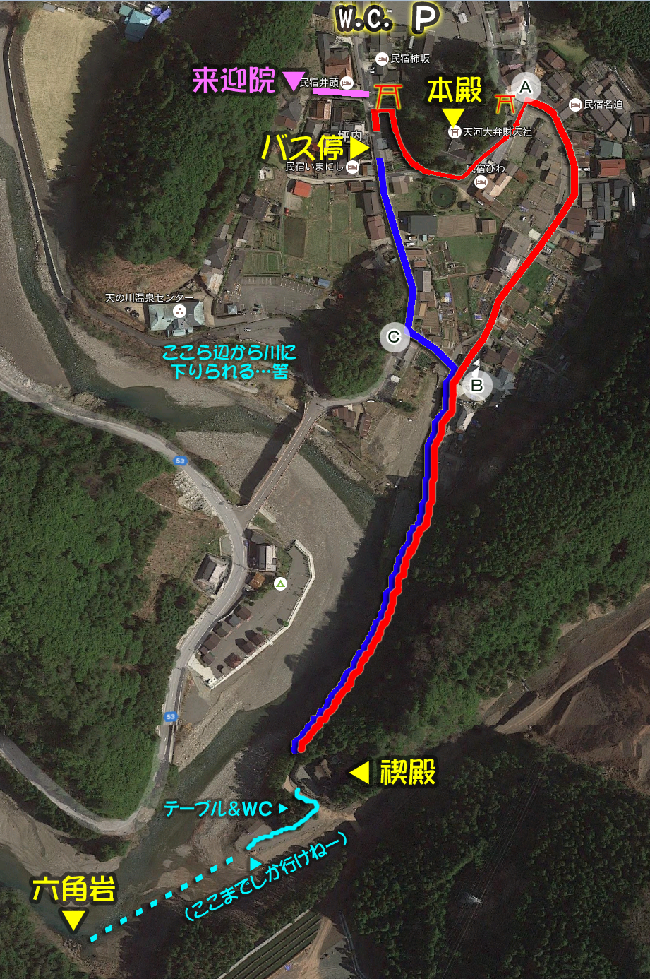 川沿いを走り、水が青くなって来たら天河神社が近付いて来た印。