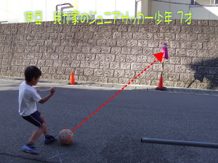 カラーコーンをゴールポストに見立てて右側のピンク色のタオルを狙う練習。斜めシュート。