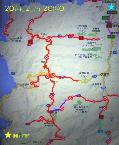 左下の我が家から右上の青★マークまで行く為には、山越えか海沿いの2パターンですがどちらも通行止めマーク。