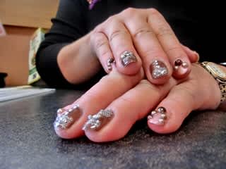 チョコレート気分★ 本日のネイル 聖バレンタインつーことで ちょこっとチョコレートネイル なんつって(笑) ピンクのベースと ブラウンのベースに ストーン・パールとレースをアレンジ あくまでもチョコっぽく チョコっぽく仕上げたつもりでしたがぁ ちと ブツブツしすぎ ました・・・ とはいえ ピンクとブラウンのバランスはまずまず いい!! とってもいい!! ってことで(笑) いわゆる 自己満足ですが・・・
