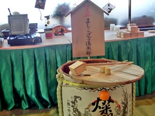ロビーで 樽酒とお雑煮&おしるこ のサービス。