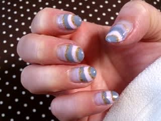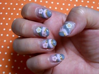 指先は春爛漫★ 本日のネイル ポップなボーダーに フラワーデコで春待ち気分の指先 グレーとピンクのボーダーに ゴールドのラメで引き締めて・・・ このベースに スライス棒のお花をプラス で 完成~ ちょいと渋めで レトロっぽかったボーダーが キュートで ポップな春ネイル に大変身 グレーをパステルグリーンにしても さらに春っぽく仕上がるかも・・・♪ いわゆる自己満足ですが (^▽^;)