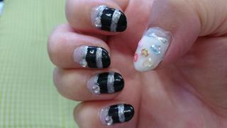 ブラック×シルバー大人ネイル★ 本日のネイル ブラックとシルバーのストライプに 一粒のスワロを添えて・・・ 親指だけホワイト×シルバーに ホロハートでちょっと遊んでみました ・・・でもね 思ったよりも違うテイストになってしまって ちょっと しくったかなぁ・・・ 可愛い&coolは 相性イマイチが分かったので よい勉強になりました(笑) 次はあまあまにしてみよっと いわゆる自己満足ですが・・・(^▽^;)
