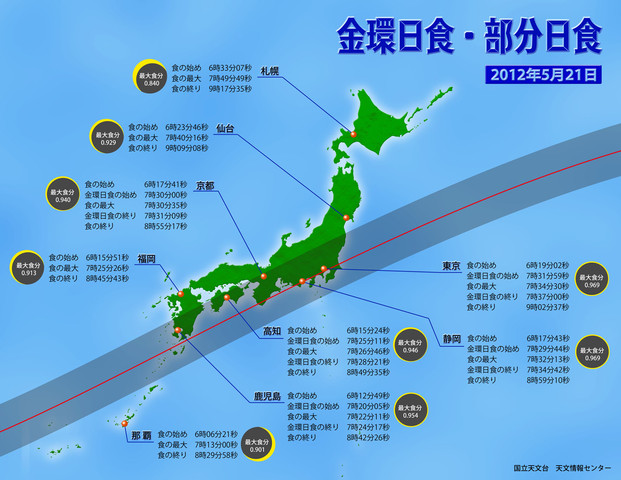 一方で、本日5月11日は、何かと話題の「金環日食」のちょうど10日前です。もう、目前まで迫ってきました。今回の「金環日食」は、まさに日本のための天体ショーと言ってもよいほど、九州南部・四国の大部分・紀伊半島から南関東までの太平洋を中心とした広い範囲で観測ができます。