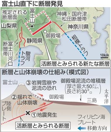 地面を震動させて地下構造を調べた結果、長さは北東―南西に約30キロ・メートルで、断層の両側から押し合う力が働く「逆断層」タイプ。富士山頂の方向に深くなっており、山頂直下では深さ十数キロ・メートルに達しているとみられる。最近100万年の間に動いた形跡がみられるが、動いた時期や周期はわかっていない。(2012年5月11日07時07分 読売新聞)