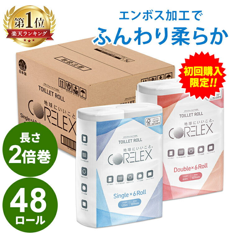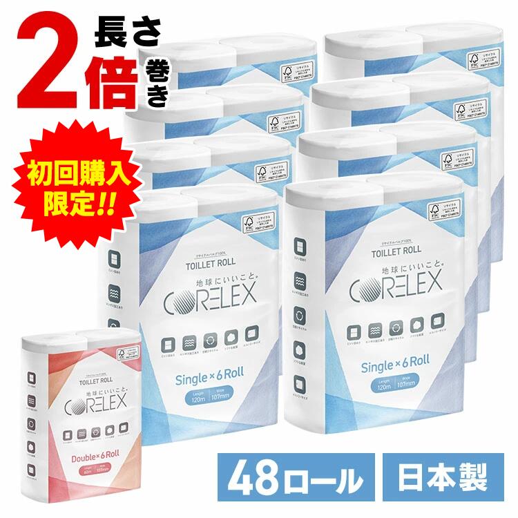 【初回購入限定祭】【48ロール】トイレットペーパー シングル ダブル 送料無料 2倍巻き 6ロール×8P ダブル 60m シングル 120m 日本製 送料無料 国産 大容量 コアレックス CORELEX 倍巻 再生紙 シングル楽天市場3,980円${EVENT_LABEL_01_TEXT}
