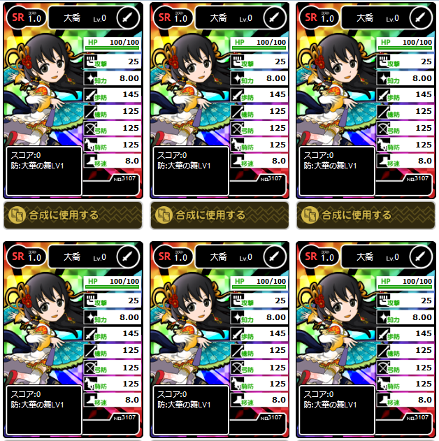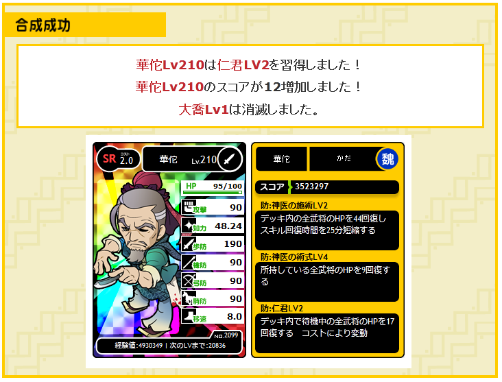 合成は覇王・攻城・豊穣・弓采配。悪くはないけど手持ちと比べるとイマイチぱっとしない