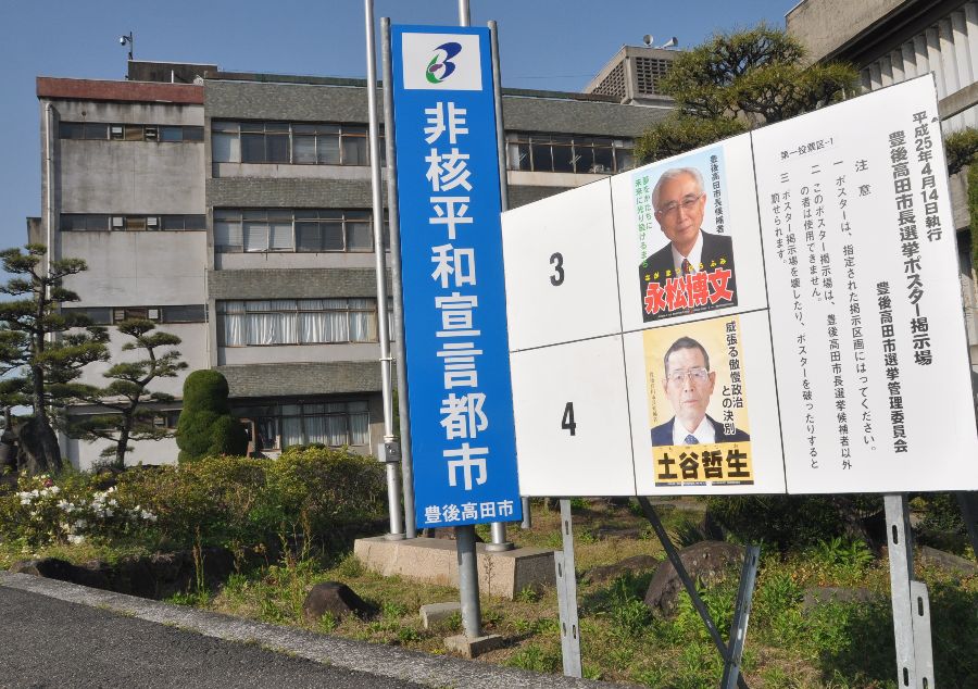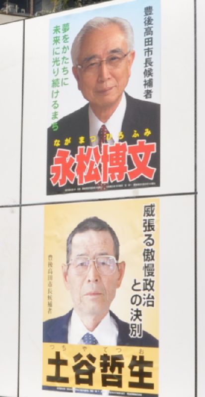 永松市長は1998年12月の市長選で初当選、市町村合併前の旧市時代を含める3回無投票、今回も現職永松市長の無投票と思われていましたが、市長の地元で遠縁にあたる元農協理事の土谷哲生氏が「無投票阻止を掲げ」急きょ立候補したため、15年ぶりの市長選挙となりました。