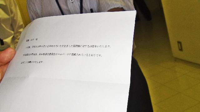 「日付なし、回答者・所管名なしのこの文書は『回答』足り得るのか。このような ことはこれまでになかったこと、今回このようになったのはなぜか」と訊くとA係長 は、「情報課は政策課から回答を送ったと報告を受けた。団体ではなく、個人が質問 をした場合はこういうことがある」と言いました。個人は軽く扱う? いいえ、回答 の責任所在をうやむやにしたかったのでしょう。「今日中に電話をくれるよう政策課 に伝えてほしい」とA係長に頼んできましたが、夜になっても電話はありません。