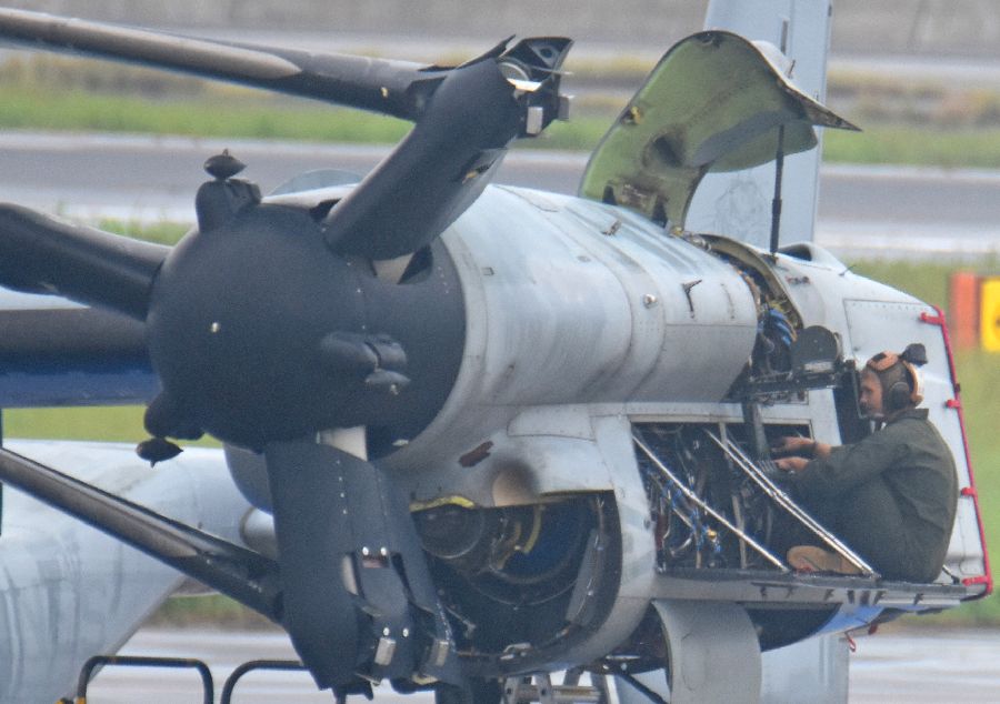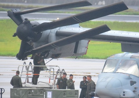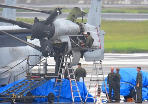 岩国基地から普天間飛行場に向かう途中にエンジントラブルで大分空港の緊急着陸したオスプレイは、民間空港を占拠して8日目の5日も雨の中で米軍の作業員10数名が、左右のエンジン交換した後の整備作業をしていました。