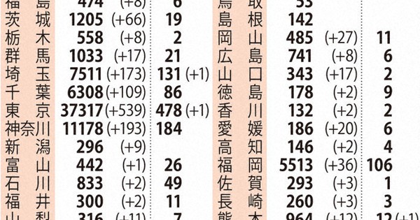 東京都の新規感染者は過去最多の539人で3日連続500人を超えた。重症者は20日より3人増えて40人。大阪府も過去最多の415人で初めて400人を超えた。ほかに、埼玉県(173人)、兵庫県(150人)、千葉県(109人)、茨城県(66人)、愛媛県(20人)などで過去最多となった。