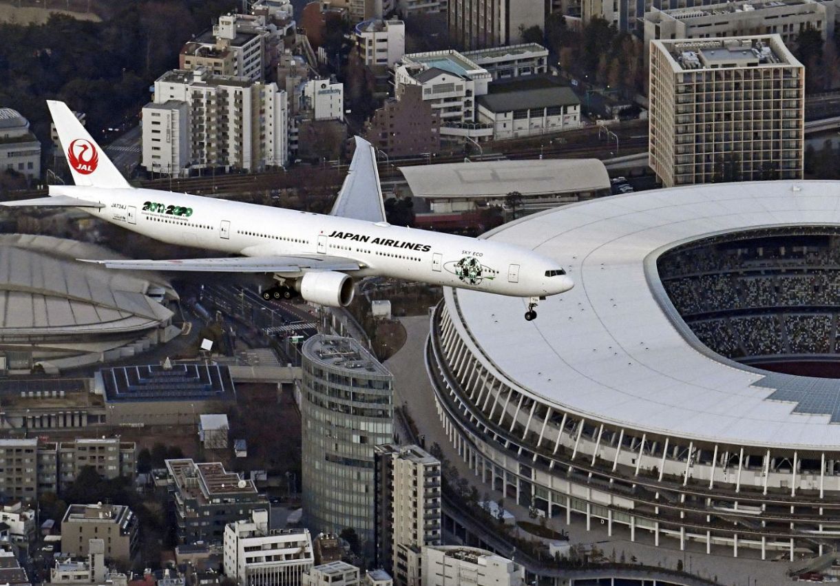 羽田新ルートの都心上空を飛行する旅客機=2020年2月
