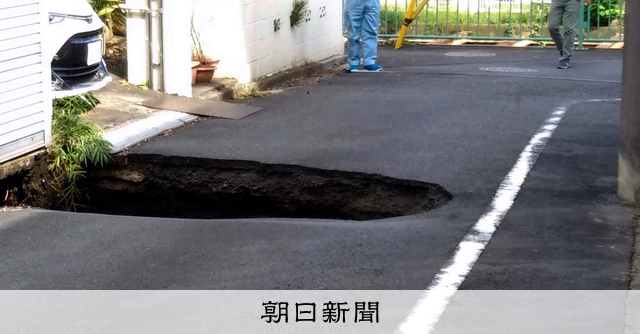 地下トンネル掘削工事のルート上で起きた道路陥没=2020年10月18日午後0時半、東京都調布市東つつじケ丘2丁目、読者提供
