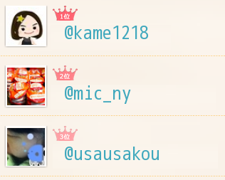 2013.5.11(Sat)のついーと1番仲の良いランキング 1位@kame1218 2位@mic_ny 3位@usausakou → goo.gl/uakWi あなたのランキングもチェック♫ https://pic.twitter.com/zucqpnDkWQ posted at 23:58:03@ryoku_bluesky どうしたー!?(@◇@)っ posted at 23:52:12恋煩い真っ最中なそのお相手は 年下の上司なのでした(# v◇v)っ posted at 23:21:44今夜も家飲み独り飲み...けっこう飲んだ(^◇^;)っ posted at 23:20:21味いちもんめは ら・ら・ら かー♪ 大黒摩季 さんめっちゃ懐かしいわー思い出もいっぱいだよね(# v◇v)っ posted at 23:19:34@kame1218 明日がお友達の結婚式でした?(・◇・)っ posted at 22:43:23おおおー!今後ともよろしくお願いします!!(⌒◇⌒)っ → フレンドランキング goo.gl/uakWi posted at 21:42:00あ 5月11日は初恋の人の誕生日なり(・◇・ι) posted at 19:59:25@kame1218 楽しいお酒をー♪飲み過ぎ注意よ(・◇・)っ posted at 19:31:41RT @MIKITO_777: 昨日は暑かったですね、すでに熱中症での救急搬送もあったようなので皆さんお気をつけ下さい。普段スポーツなどで汗をかく習慣が無い方は汗腺が発達していなくて、汗による体温調節が不十分になりやすいのでとくにご注意下さい posted at 14:21:35RT @MIKITO_777: 救急でかなり交通事故で亡くなる人を見たけど、ふと思い起こすとちゃんとシートベルトして乗車していた人が亡くなったのを見たことないかも。乗車していて死亡した人は後部座席とかでシートベルトしていなかった人が多い気がする。そう考えると後部座席のシートベルト義務化も当然の流れなんだろうなぁ posted at 14:21:23@mic_ny 日本と同じぐらい?どうなの???(>◇<)っ posted at 14:13:45ガーンと低下しているモチベーションを持ち上げて 頑張ってお仕事いくぞー(`◇ ´ )っ posted at 07:33:27やっぱり 私の中での口紅の女王さまは AUBE プレミアムルージュだわ(・◇・)っ posted at 07:32:25本日のNHKさんのテンションが気になるわたくし(^◇^;)っ posted at 07:28:02@kame1218 そうしましょー(⌒◇⌒)っ posted at 07:12:32@kame1218 だよねー まぁ仕方ないわ( 。・◇・。) っ posted at 07:02:08@kame1218 それはコレから相談になるかと思いますが...やっぱりお天気どうかしら(。-◇-。)っ posted at 06:58:38@kame1218 26日はね― 到着後の午後にさっそく潜る予定になっています(⌒◇⌒)っ posted at 06:53:01@mic_ny どんまい どんまい(・◇・)っ posted at 06:44:50@kame1218 かめちゃんおはよー いってらっしゃい(・◇・)っ posted at 06:42:24『2013.5.10(Fri)のついーと』 amba.to/15VCCZW posted at 06:15:27眠れなかったー しかも朝から何かとポカ続出...気をつけなくっちゃね(>◇<)っ posted at 06:12:59おはようございます(・◇・)っ 今日もクリック募金をしました。 #bokin #kifu bit.ly/hP24xC posted at 06:11:49[Twitter]2013/05/10 のついーと htn.to/4AjW6o posted at 04:01:39