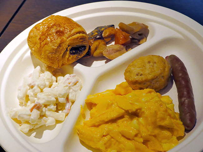 欧米ではありえない朝からマカロニサラダ、そしてスクランブルエッグたっぷりにチョコクロワッサン、サバに筑前煮!これで味噌汁もらったらアメリカ人としての自分を否定しすぎると思って、コーンスープとエスプレッソを奪取。