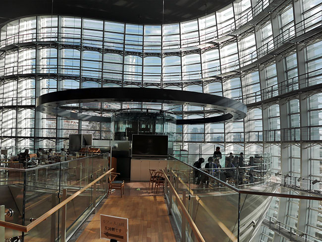 ここ、展示室の外に喫茶室があります。半中空で円形の形状がおもしろそうです...。
