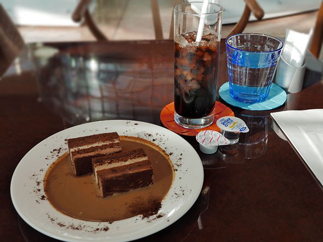 見本写真からそれほど乖離していないことには好感が持てました。お味のほうは... 下手くそなティラミスみたい。でも甘さがそこそこ適度なソースを吸わせて食べて、アイスコーシーを、うぐうぐ。結構これで愉しめました。