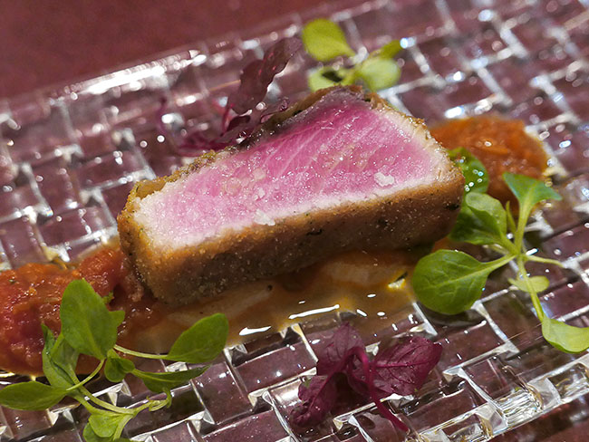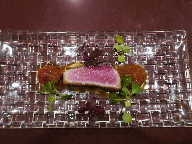 衣を付けた状態でタタキみたいに外側に火を入れて、でも中は生でおいしい。サルサっぽいソースにマッシュ添え。