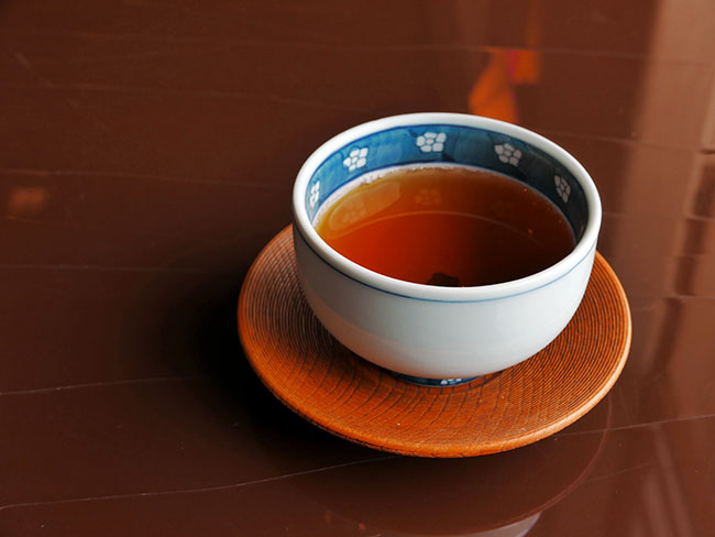 窓外の眺望がよろしいカウンター席に通していただき、薫り高い焙じ茶が出されました。ぁぁニッポンだ、の瞬間。