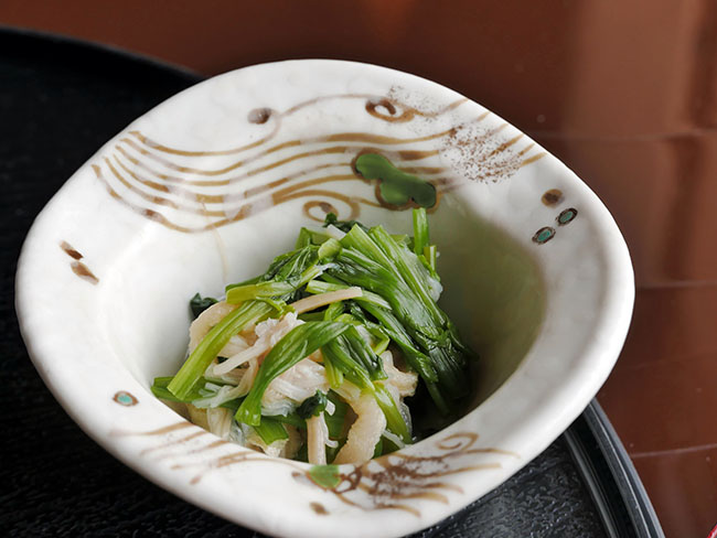 こんな付け合わせも。下町訛りの父に言わせると「おしたし」です。(嫁にもらって半世紀以上も経つのに父が母の血馬訛りを指摘していびるので、母へ反撃の方法として『朝日新聞』とか『潮干狩り』を父に言わせることを入れ智慧w)