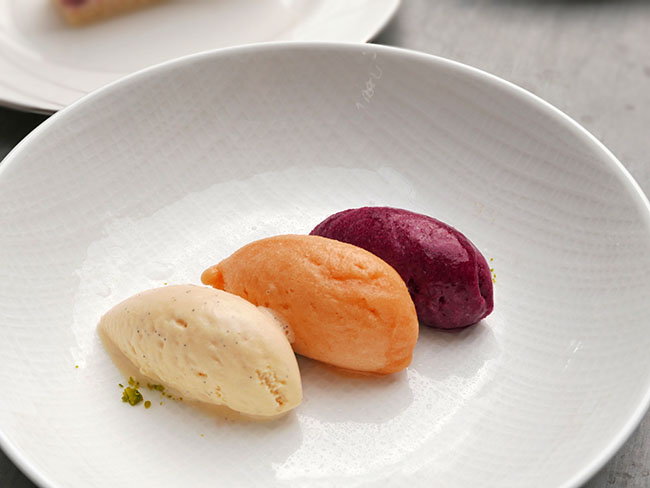 ヴァニラ、ピーチ(だったっけ?)そしてフランボワーズの三色です。ピスタチオが散らしてありました。