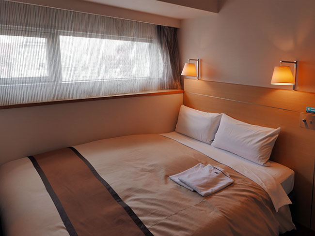 でもダブルなのにベッドがこんな狭い... ふけでぶ同士じゃこんな狭いところに二人も眠れないので、見て一発で断念。ちなみにこのホテルって「ツイン」の設定はありません。おふたり様でご利用の場合はダブルになるそうです。